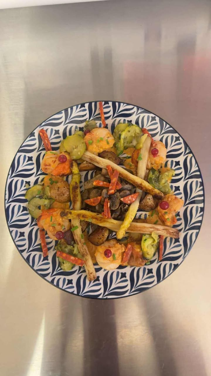 Noix de St Jacques fraiches, pêchés dans l’Atlantique, avec sa crème de chorizo maison et son accompagnement local : 25€50